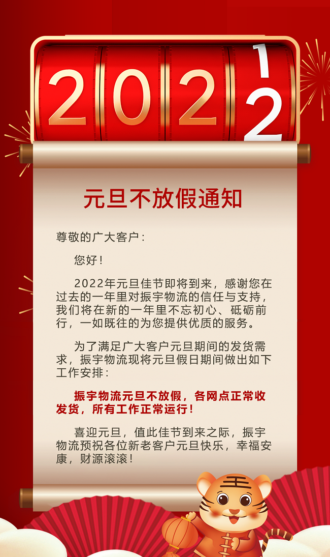 2022年元旦佳節即將到來,感謝您在過去的一年里對振宇物流的信任與支持,我們將在新的一年里不忘初心、砥礪前行,一如既往的為您提供優質的服務。