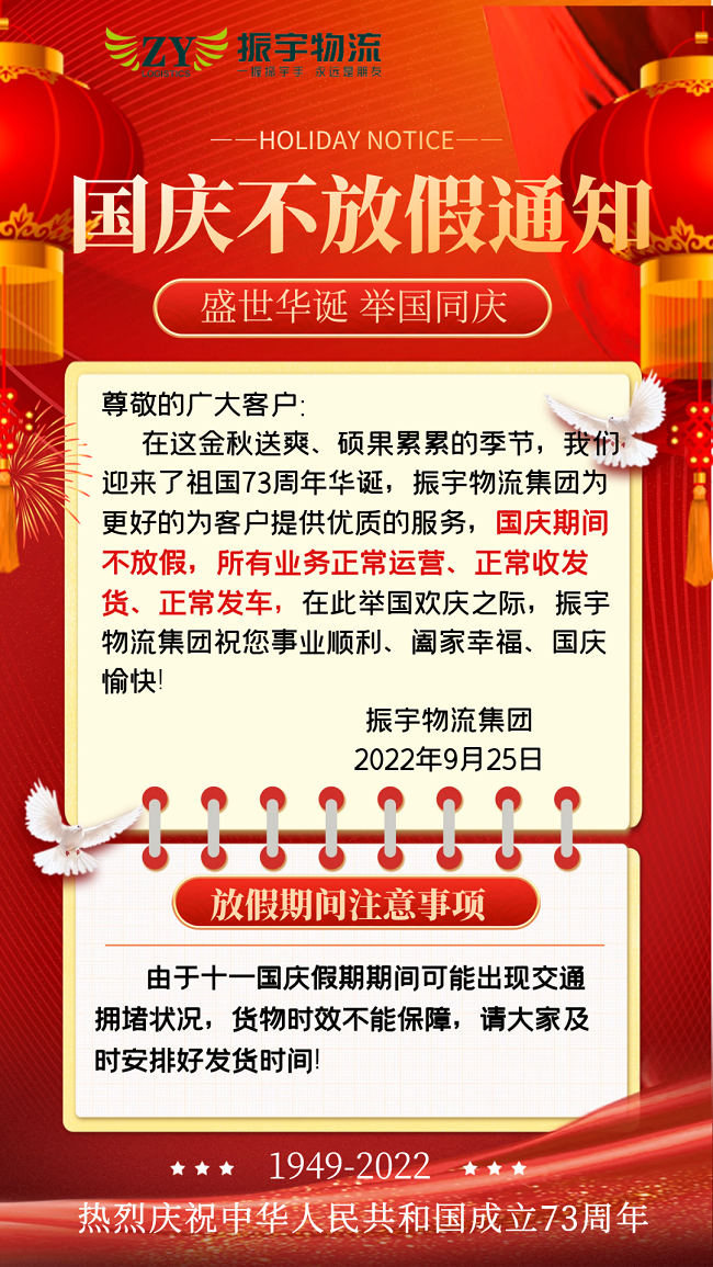 在這金秋送爽、碩果累累的季節,我們迎來了祖國73周年華誕,振宇物流集團為更好的為客戶提供優質的服務,國慶期間不放假,所有業務正常運營、正常收發貨、正常發車,在此舉國歡慶之際,振宇物流集團祝您事業順利、闔家幸福、國慶愉快!