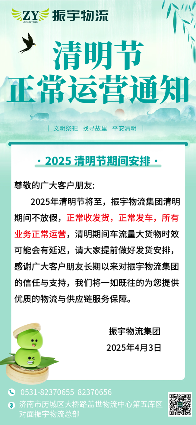 2025年清明節(jié)將至,振宇物流集團(tuán)清明期間不放假,正常收發(fā)貨,正常發(fā)車,所有業(yè)務(wù)正常運(yùn)營(yíng),清明期間車流量大貨物時(shí)效可能會(huì)有延遲,請(qǐng)大家提前做好發(fā)貨安排,感謝廣大客戶朋友長(zhǎng)期以來(lái)對(duì)振宇物流集團(tuán)的信任與支持,我們將一如既往的為您提供優(yōu)質(zhì)的物流與供應(yīng)鏈服務(wù)保障。