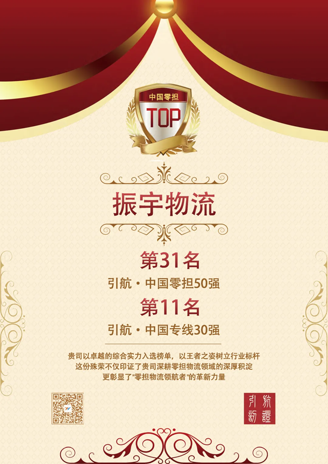 振宇物流榮膺2025引航·中國(guó)零擔(dān)50強(qiáng),位列第31名。2025引航·中國(guó)專線30強(qiáng),位列第11名。這標(biāo)志著我司在零擔(dān)物流領(lǐng)域的快速發(fā)展和專業(yè)化能力獲得行業(yè)認(rèn)可。風(fēng)正時(shí)濟(jì),自當(dāng)破浪揚(yáng)帆。任重道遠(yuǎn),更需策馬揚(yáng)鞭。振宇物流愿以本次殊榮為新起點(diǎn),不斷開(kāi)拓創(chuàng)新、與時(shí)俱進(jìn),繼續(xù)在物流與供應(yīng)鏈服務(wù)的星辰大海中,書寫屬于中國(guó)物流企業(yè)的新篇章!