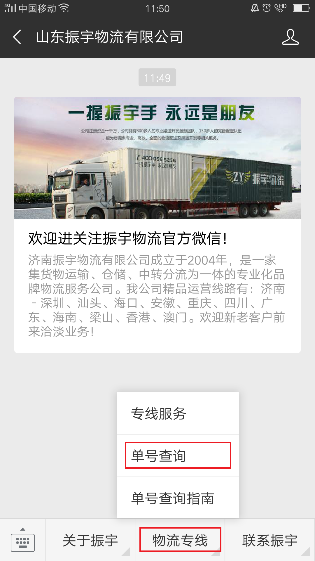 3.進入公眾號,點擊“物流專線——單號查詢”欄目。