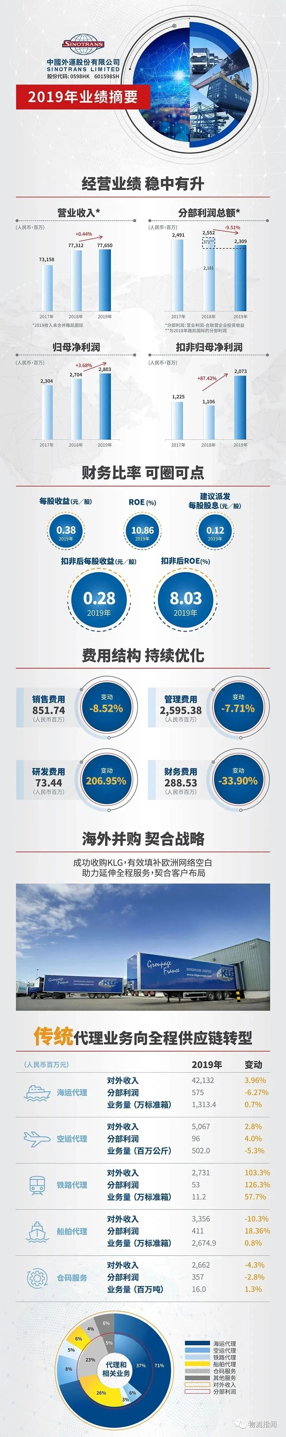 據(jù)悉,2019年,中國外運(yùn)實(shí)現(xiàn)營業(yè)收入776.50億元,同比增長0.44%(可比口徑下實(shí)現(xiàn)增長2.4%);分部利潤實(shí)現(xiàn)23.09億,可比口徑下實(shí)現(xiàn)增長5.9%。實(shí)現(xiàn)歸母凈利潤28.03億元,同比增長3.68% ;實(shí)現(xiàn)扣非后的歸母凈利潤20.73億元,同比增長87.42%。每股收益為0.38元人民幣。扣非后的ROE增長了3.08個百分點(diǎn)。