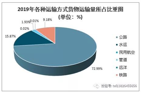 從貨物運輸的方式拉看,公路運輸仍然占據著我國貨物運輸行業的主導地位。2019年各種貨運運輸量中公路運輸量占比最大,達到了72.99%;其次為水運,占比為15.87%;鐵路運輸量占比9.18%,位居第三。我國民航運輸業起步較晚,仍處于發展階段,貨機數量整體來說相對較少,這導致2019年民航貨運量占比僅有0.02%。