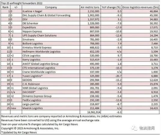 7月11日消息,第三方物流咨詢機(jī)構(gòu)Armstrong&Associates.Inc發(fā)布了最新的2022年航空貨代TOP25排名。前25家空運(yùn)貨代公司的總貨量同比下降了6.3%,達(dá)到1690萬噸。其中,前五名延續(xù)去年的排名,分別為德迅(K+N)、DHL、DSV、DB Schenker、Expeditors。德迅憑借223萬噸的空運(yùn)貨量,進(jìn)一步擴(kuò)大了對(duì)DHL的領(lǐng)先優(yōu)勢(shì),再次成為全球最大航空貨運(yùn)代理公司。排名第二的DHL去年空運(yùn)貨物量下降了9.3%,達(dá)到190萬噸,反映出了整體空運(yùn)貨代市場(chǎng)的情況。