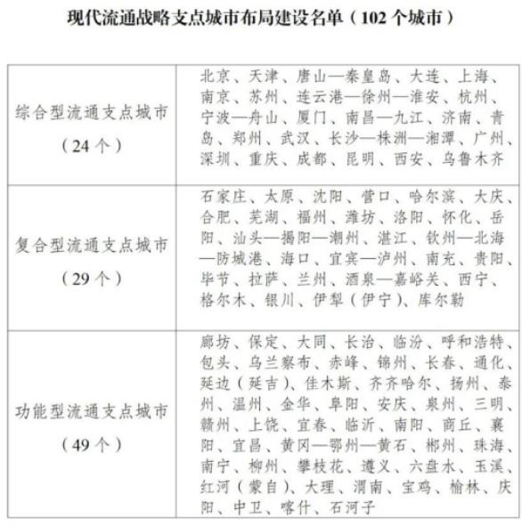 《通知》堅持系統(tǒng)思維和全局觀念,突出國家所需和城市所長,按照服務重要商品和資源要素流通、強化跨域跨界輻射帶動、促進現(xiàn)代流通發(fā)展等三個維度布局流通支點城市。綜合考慮城市資源稟賦、發(fā)展基礎、比較優(yōu)勢、未來潛力,將102個城市納入布局建設范圍,覆蓋全國31個省區(qū)市以及新疆生產(chǎn)建設兵團。流通支點城市將按綜合型、復合型、功能型分類推進建設,城市人民政府發(fā)揮主體作用部署推進,努力提升自身發(fā)展水平,增強輻射帶動作用。