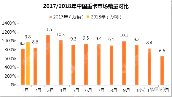 據統計數據顯示,自2016年10月開始延續至2017年10月,國內重卡市場連續13個月爆發式增長!2017年全年,國內重型貨車產量為114.97萬輛,同比增長55.07%,銷量為111.69萬輛,同比增長52.38%。而18年1月重卡市場的“開門紅”除了同環比雙雙增長以外,同時也打破了去年1月銷量8.3萬輛的紀錄。
